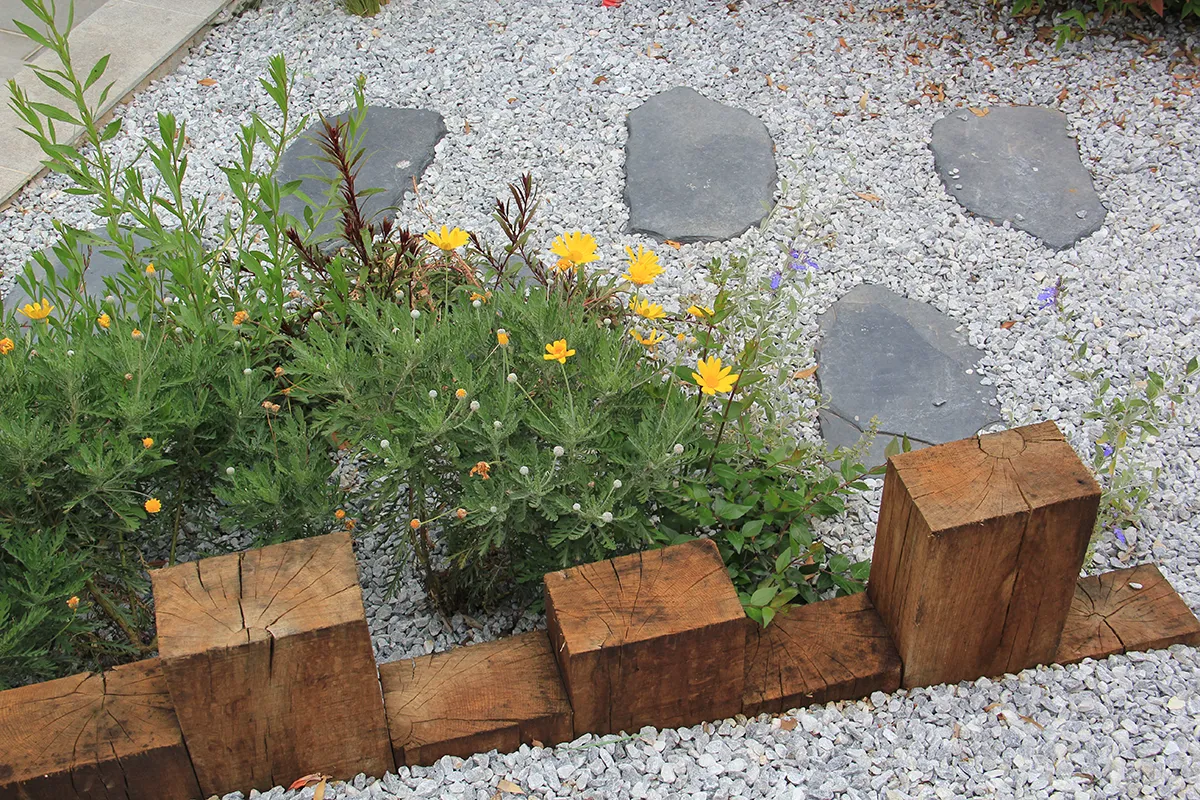 Galets jaune sunlight et traverses pin