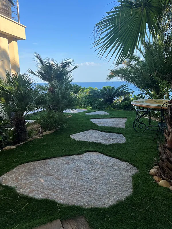 Plaques ardoise Ebano 100x30cm brique pilée et pelouse synthétique