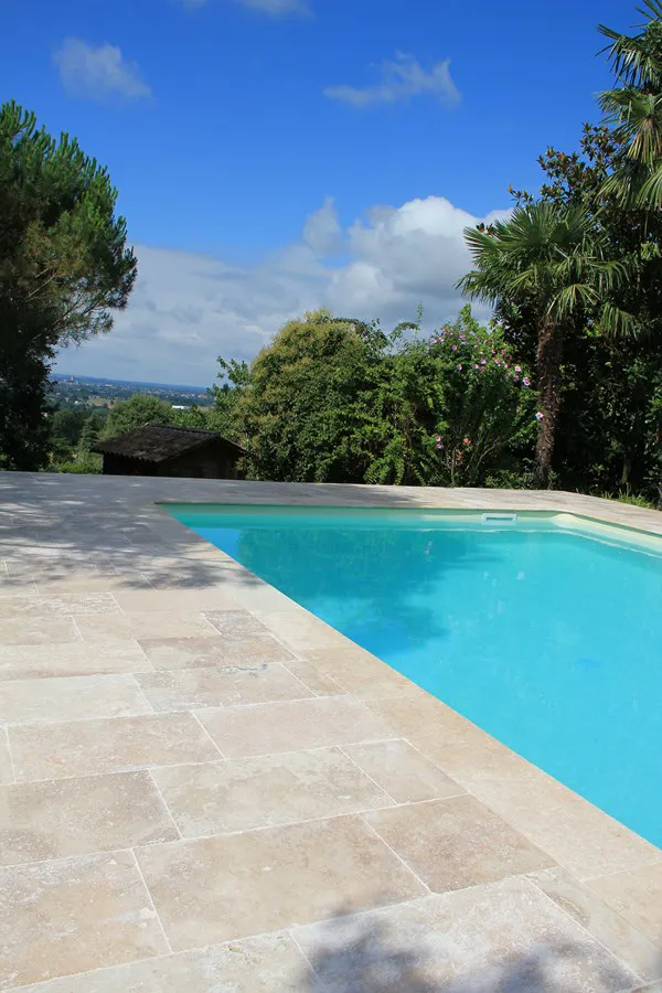 Dallage travertin rustic beige 61×40.6cm et margelles DEMI rond